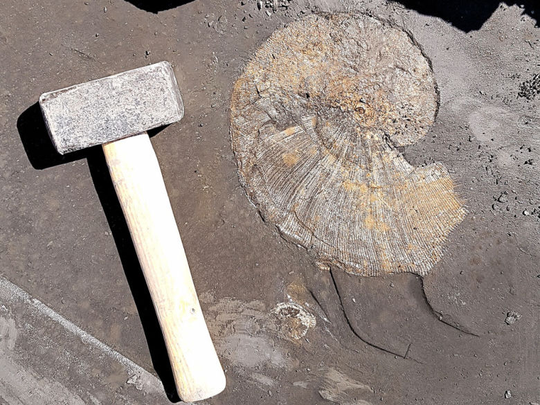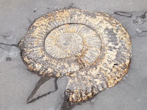 Einer der größten Ammoniten, die man hier mit viel Einsatz finden kann: Harpoceras konnte über 30 cm groß werden.