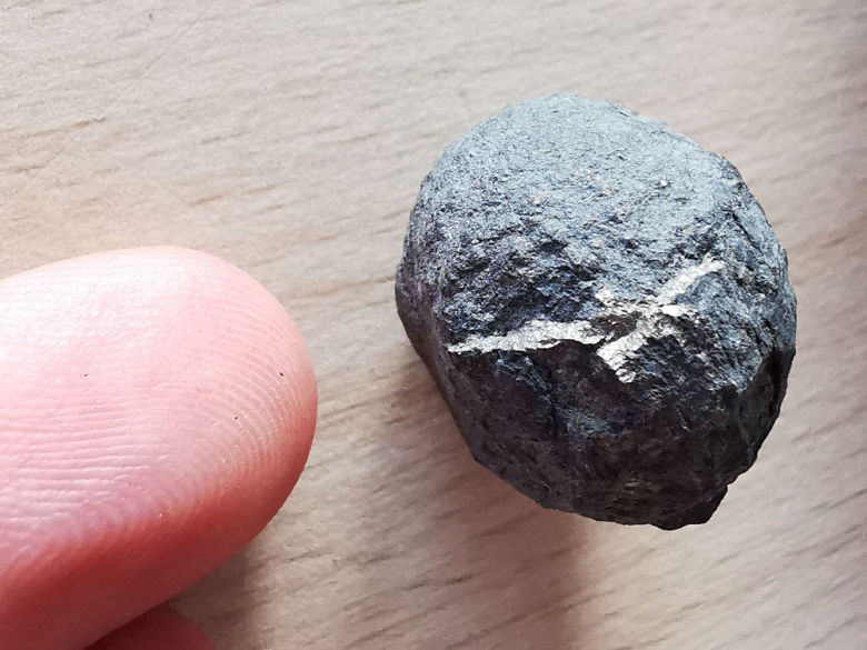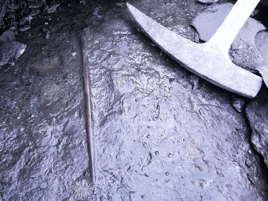 Pyrit kommt im oberen Grubenbereich auch als schwere, runde Kugel vor.