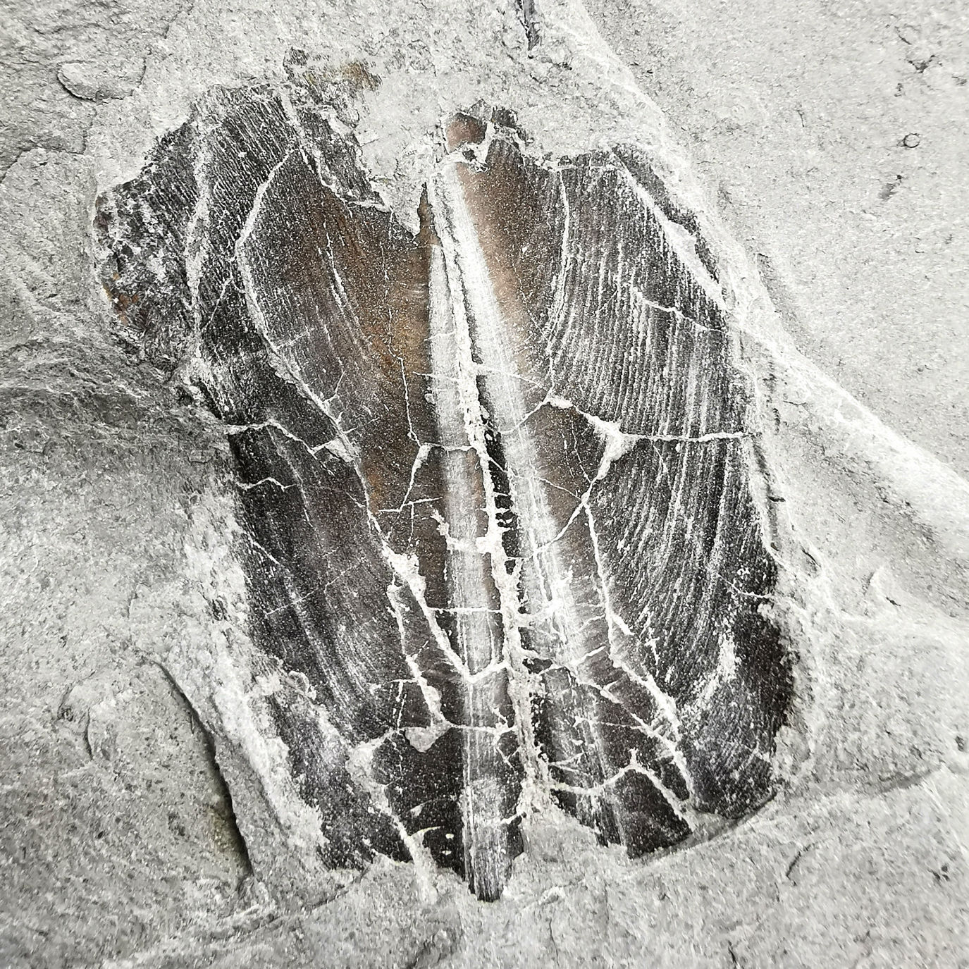 Ein Aptychus - die "Verschlussklappe" eines Ammoniten. Diese werden oft für Federn, Flossen oder Blätter gehalten. Meist findet man nur eine der beiden Hälften.