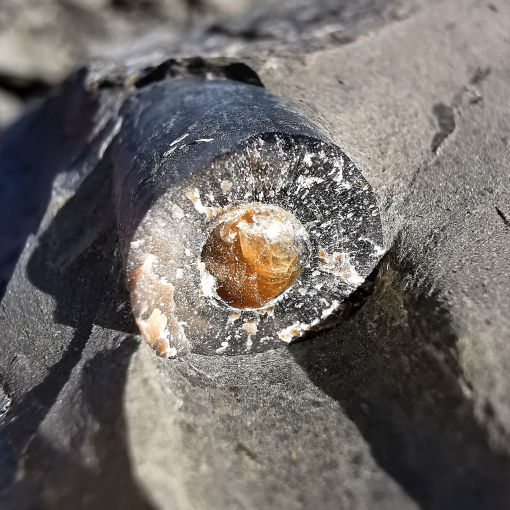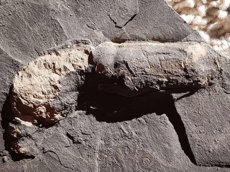 Mit viel Glück und Ausdauer lassen sich Überreste von Ichthyosauriern finden - hier eine Rippe, noch von Schiefer umhüllt. Diese Fischsaurier ähnelten den heutigen Delphinen.