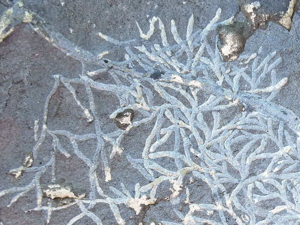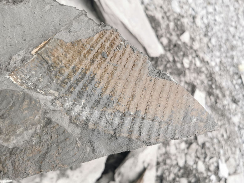 Im oberen Grubenbereich kann man diese Strukturen finden - es handelt sich um Grabgänge unbekannter Meereswürmer oder Krebstiere. Wird oft für ein Pflanzenfossil gehalten.
