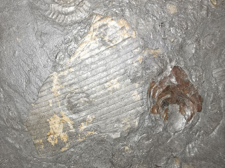 Rechts unten eine braunschalige Muschel, links daneben eine Scherbe eines Ammoniten (Phylloceras)