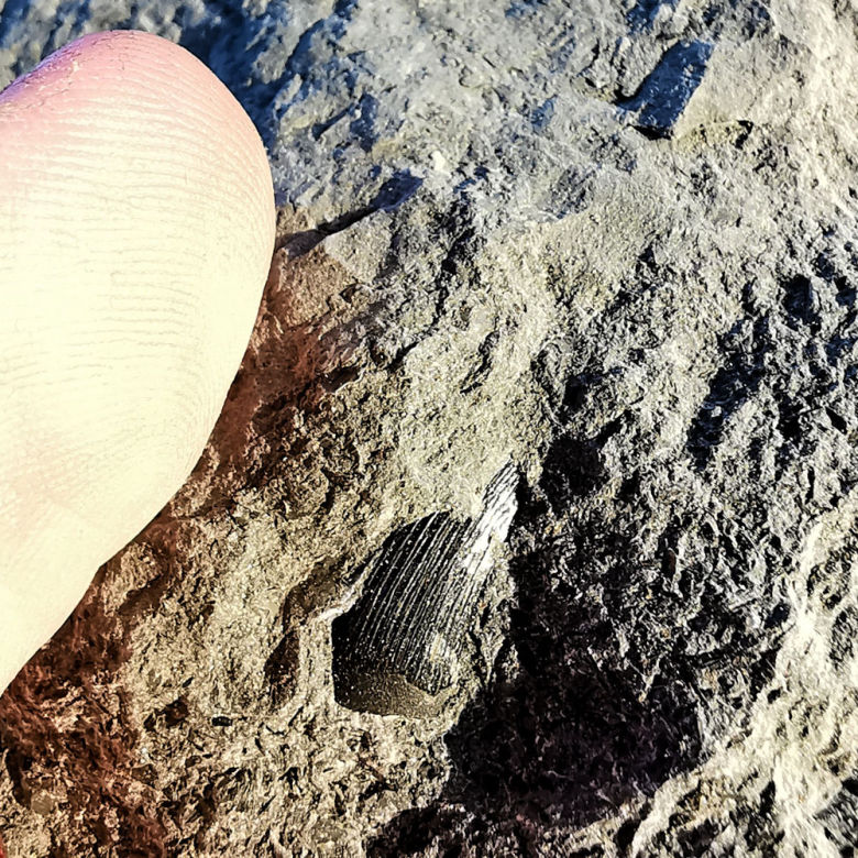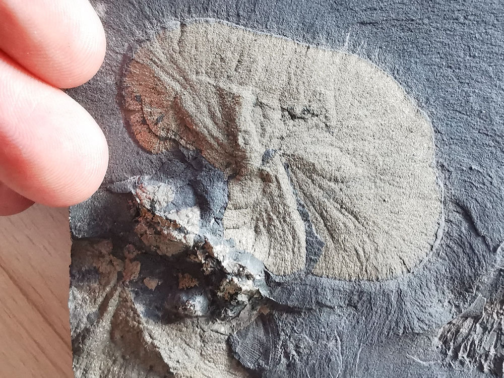 Eine Flosse? Ein Blatt? Ein Ammonit! Genauer gesagt, eine Schalenscherbe des seltenen Ammoniten Lytoceras.